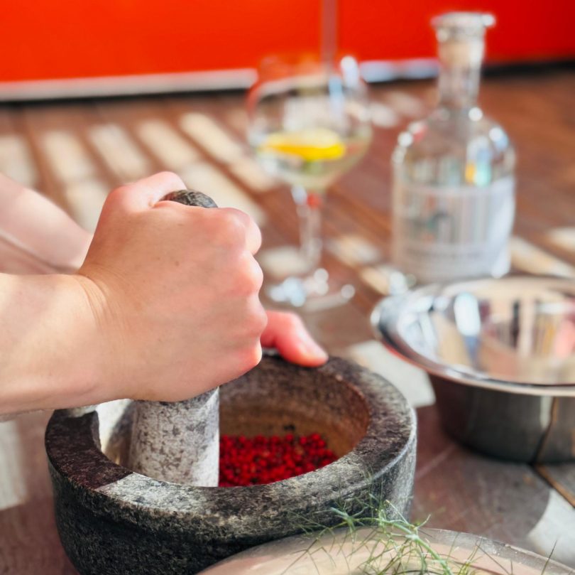 Riechen, schmecken, fühlen, sammeln und mörsern … das alles gehörte zum Besuch dazu. Denn an diesem Tag wurde der Grundstein für den Handwerksform Gin gelegt. Nun gibt es ihn, den eigenen Handwerksform Gin- handwerklich, kreativ und durch und durch aus Hannover!